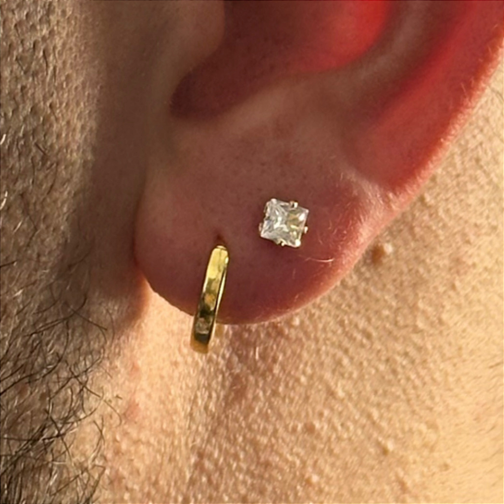 2 PARES DE BRINCOS, ARGOLA LISA TAMANHO M E BRINCO CRAVEJADO QUADRADO 2MM PP - BANHADO A OURO 18K